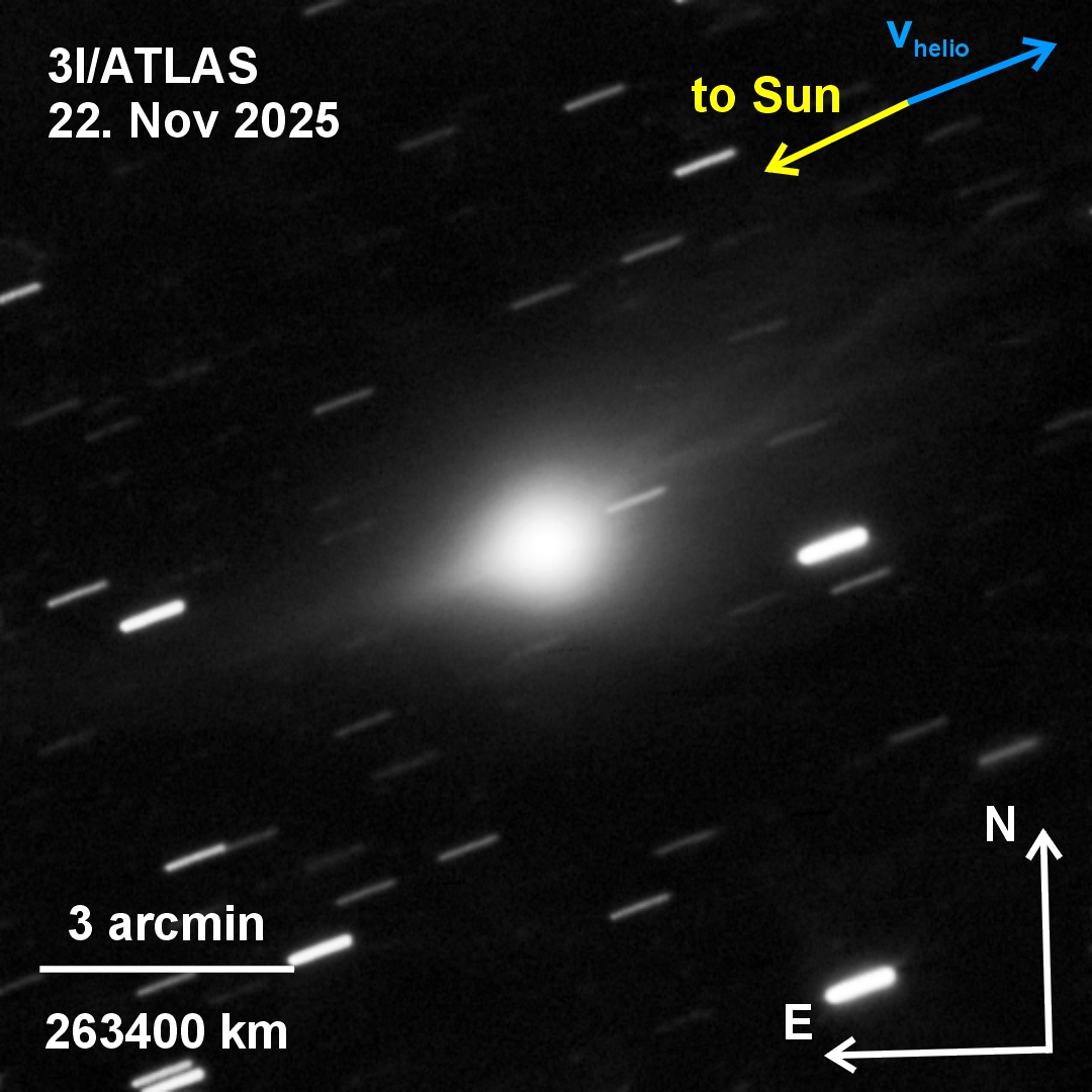 Der interstellare Komet 3I/ATLAS, aufgenommen am Morgen des 22. November 2025 an der Universitäts-Sternwarte in Großschwabhausen mit der Schmidt-Teleskop-Kamera im R-Band. Die Richtung der heliozentrischen Geschwindigkeit des Kometen ist als blauer Pfeil, die Richtung zur Sonne als gelber Pfeil gekennzeichnet. Der Plasmaschweif des Kometen weist in nordwestliche Richtung von der Sonne weg. Ein ausgeprägter Gegenschweif ist in südöstlicher Richtung zu erkennen.