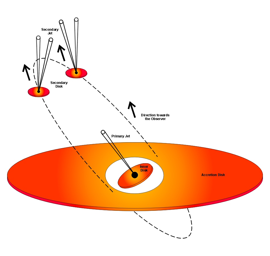 Links: Darstellung des OJ 287-Binärsystems, bestehend aus zwei supermassereichen Schwarzen Löchern, die sich mit einer Periode von etwa 12 Jahren umkreisen. Das primäre Schwarze Loch liegt im Brennpunkt der exzentrischen Umlaufbahn des sekundären Schwarzen Lochs. Das primäre Schwarze Loch ist von einer Akkretionsscheibe umgeben, deren zentraler Teil bis zu einem Abstand von einigen Schwarzschildradien vom Schwarzen Loch aufgrund der Spin-Bahn-Wechselwirkung relativ zur Hauptscheibe geneigt ist. Der primäre Jet steht senkrecht zur Scheibe. In der Abbildung ist das sekundäre Schwarze Loch in zwei verschiedenen Umlaufphasen dargestellt. Seine Akkretionsscheibe ist parallel zur Hauptakkretionsscheibe orientiert und ihr Jet steht senkrecht zur Hauptscheibe (dargestellt als gestrichelter Jet). Wegen der hochrelativistischen Dynamik des OJ 287-Binärsystems erscheint der sekundäre Jet jedoch in Richtung der Umlaufbewegung geneigt, sodass sich seine Richtung ständig ändert. In dieser Darstellung verläuft die Umlaufbewegung des Systems gegen den Uhrzeigersinn.