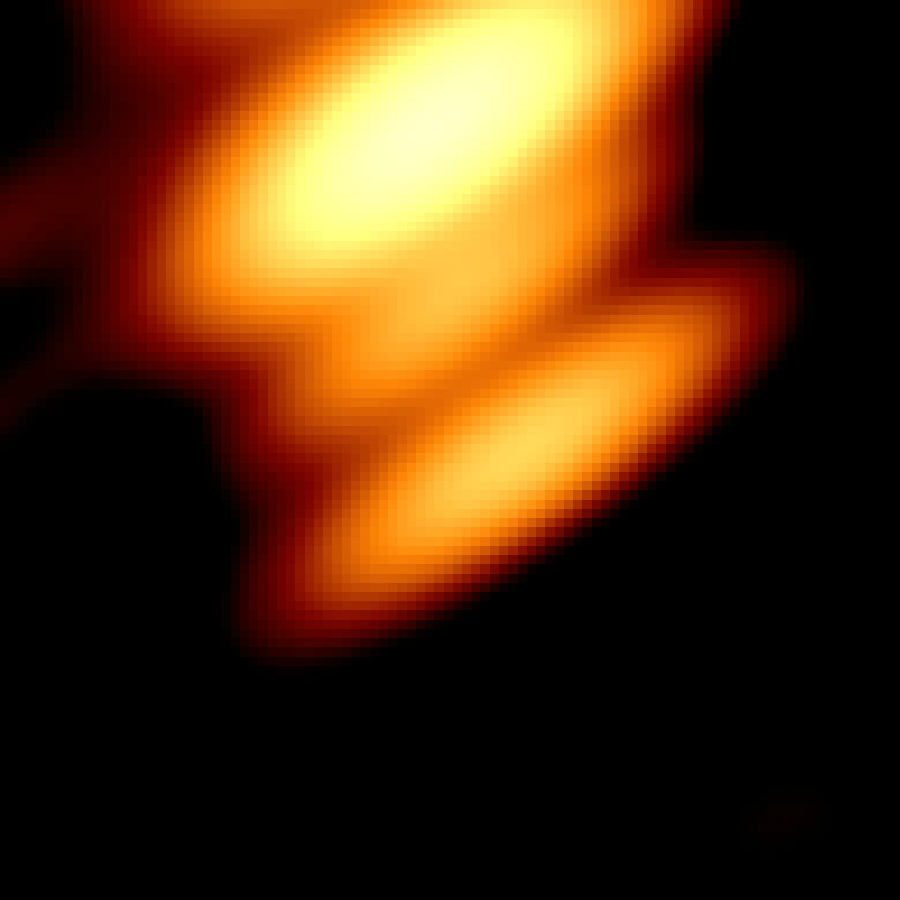 Rechts: Ausschnitt eines hochaufgelösten (40 x 12 µas) Radiobildes des Blazars OJ 287, das bei einer Frequenz von 22 GHz mit dem Weltraumobservatorium RadioAstron in Kombination mit bodengebundenen Radioteleskopen aufgenommen wurde (Gomez et al. 2022, ApJ 924, 16). Die beiden unteren hellen Streifen sind die von den beiden Schwarzen Löchern detektierte Radiostrahlung. Der untere Streifen stammt vom primären, der darüber liegende Streifen vom sekundären Schwarzen Loch und der oberste Streifen von dessen Jet. Die sichtbare Elongation der einzelnen Komponenten ist nicht real, sondern entspricht der Punktbildfunktion des verwendeten Beobachtungssystems.