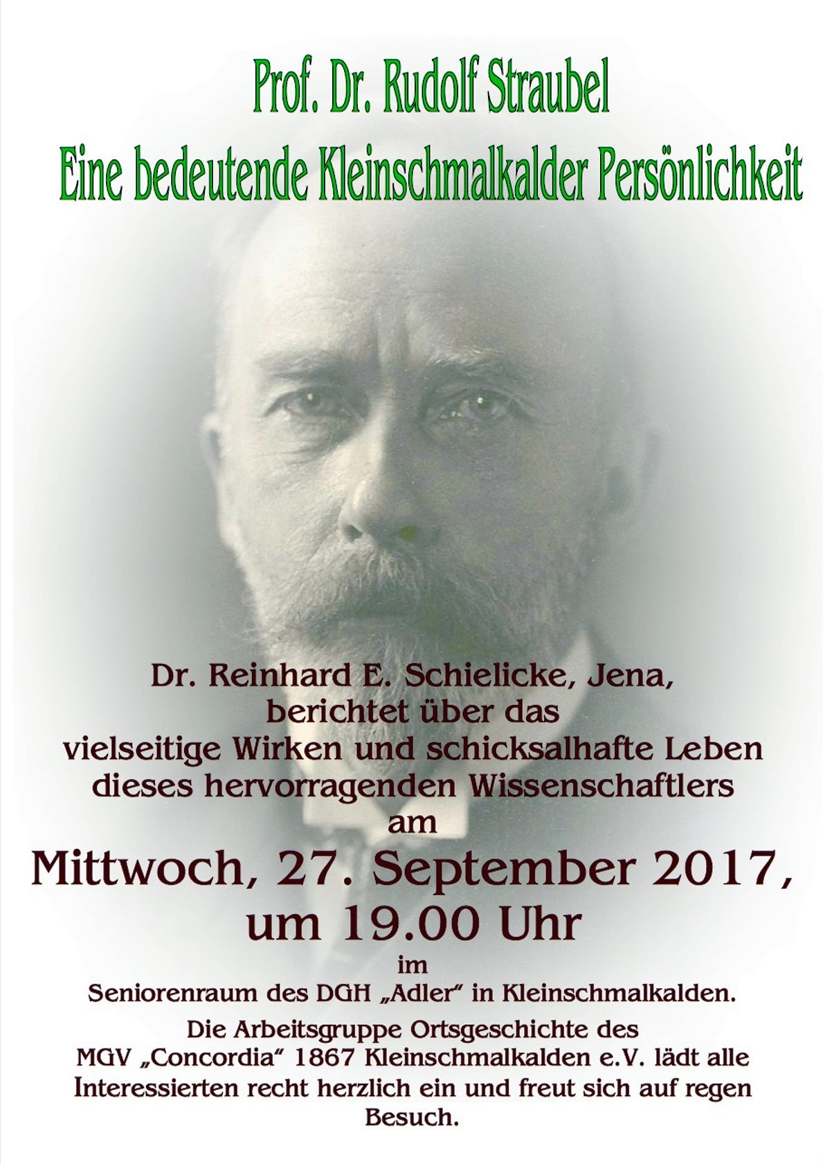 - Am 13. Juli 2017 ist im Stadtmuseum Jena eine Sonderausstellung "Die Saale und Jena" eröffnet worden. - Michael Buckland, Prof. em. an der Berkeley School of Information, hat die Straubel-Biografie in das Quellen-Verzeichnis seiner Emanuel-Goldberg-Webpage aufgenommen. - Am 23. August 2017 haben der Ortswegewart Gerhard Ringer und der Ortschronist Rainer König in Kleinschmalkalden neben der Gedenktafel bei Rudolf Straubels Geburtshaus eine erläuternde Texttafel angebracht (zwei Fotos: Rainer König). - Vortrag in Rudolf Straubels Heimatort Kleinschmalkalden - Eine Richtigstellung aus Kleinschmalkalden: Das in der Biografie auf Seite 15 erwähnte Heimatmuseum ist derzeit im ursprünglich zum Handelsgeschäft Dellit gehörenden Gebäude beheimatet, das später als Gemeindeverwaltung und Bürgermeisteramt genutzt worden ist. - Das stattliche Sterzingsche Anwesen war das Gebäude mit der heutigen Anschrift Friedrichrodaer Straße 18. - Tag des offenen Denkmals in Jena am 16. September 2017: Im Wasserwerk Burgau arbeitet die nach Rudolf Straubels Vorgaben von der AEG im Jahre 1912 gebaute 10-kV-Dynamomaschine weiterhin einwandfrei (siehe Harald Straubels Bemerkung auf Seite 145 der Biografie). - Präsentation des Verlages VOPELIUS Jena auf der Frankfurter Buchmesse, 11. bis 15. Oktober 2017. - Auf Einladung des Dekans der Physikalisch-Astronomischen Fakultät der Universität Jena, Prof. Dr. Andreas Wipf, ist die Biografie Rudolf Straubels im öffentlichen Teil der Fakultätsratssitzung am 19. Oktober 2017 vorgestellt worden.