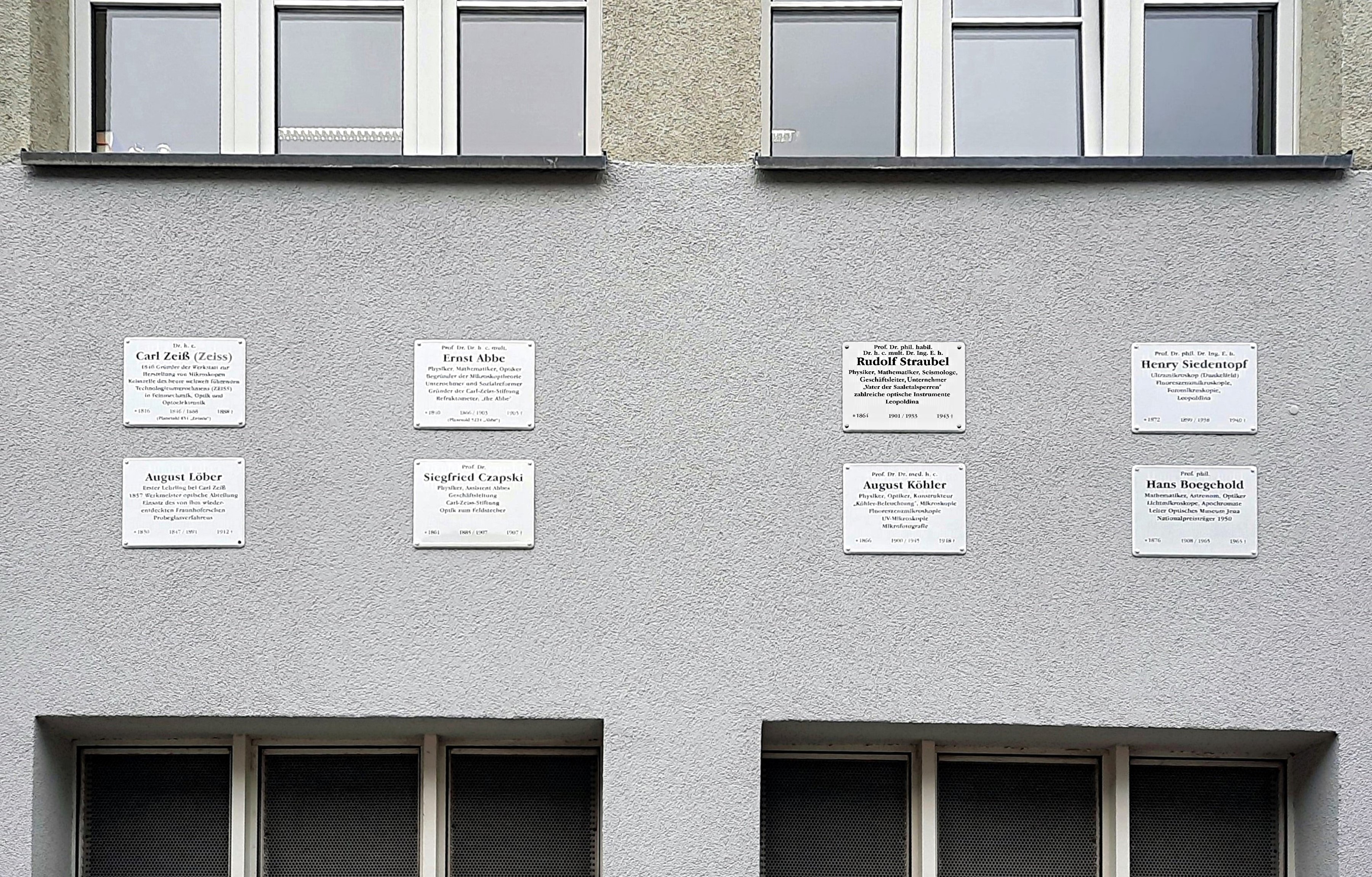 - Im Dezember 2020 sind eine Reihe herausragender Persönlichkeiten der Zeiss-Geschichte durch in Jena übliche Gedenktafeln geehrt worden. Zunächst 17 dieser Tafeln wurden um den Bau 15 - das erste Hochhaus Deutschlands aus dem Jahr 1915 - im jetzt allgemein zugänglichen ehemaligen Zeiss-Hauptwerk mitten in der Stadt angebracht. Darunter an prominenter Stelle eine Tafel für Rudolf Straubel: